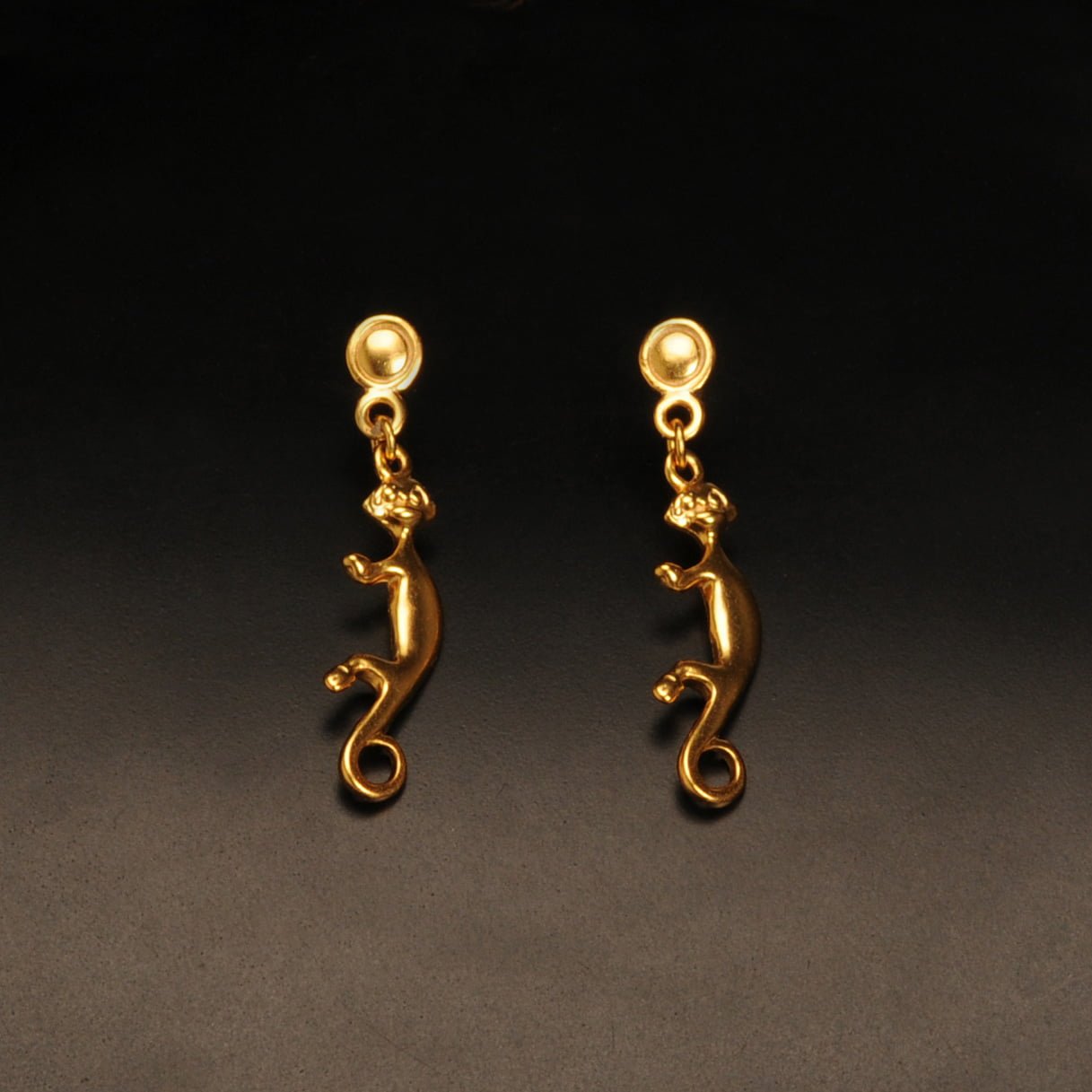 Cercei atarnatori maimuta – Bijuterie exotica, traditional sud-americana, cu stil unic si simbolistica deosebita. Acesti cercei atarnatori maimuta au un sistem de prindere cu surub din material antialergic, care se poate schimba cu tortita inchisa. Aliaj de argint cu staniu placat cu aur de 24k. Nu contine nichel. Aceste bijuterii cu aspect vintage sunt fabricate de artizani columbieni care, de-a lungul generatiilor, au pastrat traditia artei precolumbiene.
