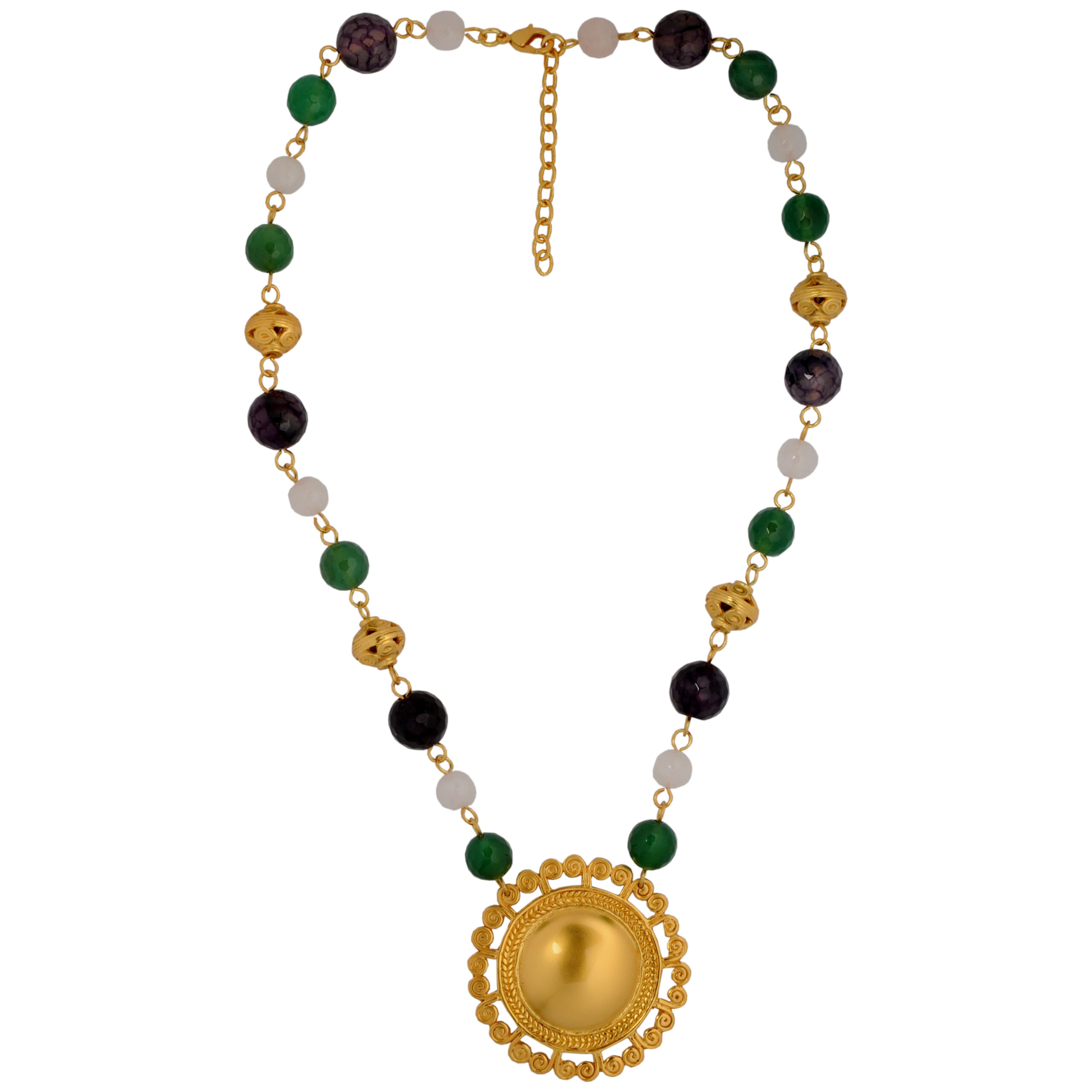 HomeColiereColiere pietre semipretioaseColier cu agate, cuart, separatoare si pandantiv soare invelit cu pene de paun, cultura Tolima
