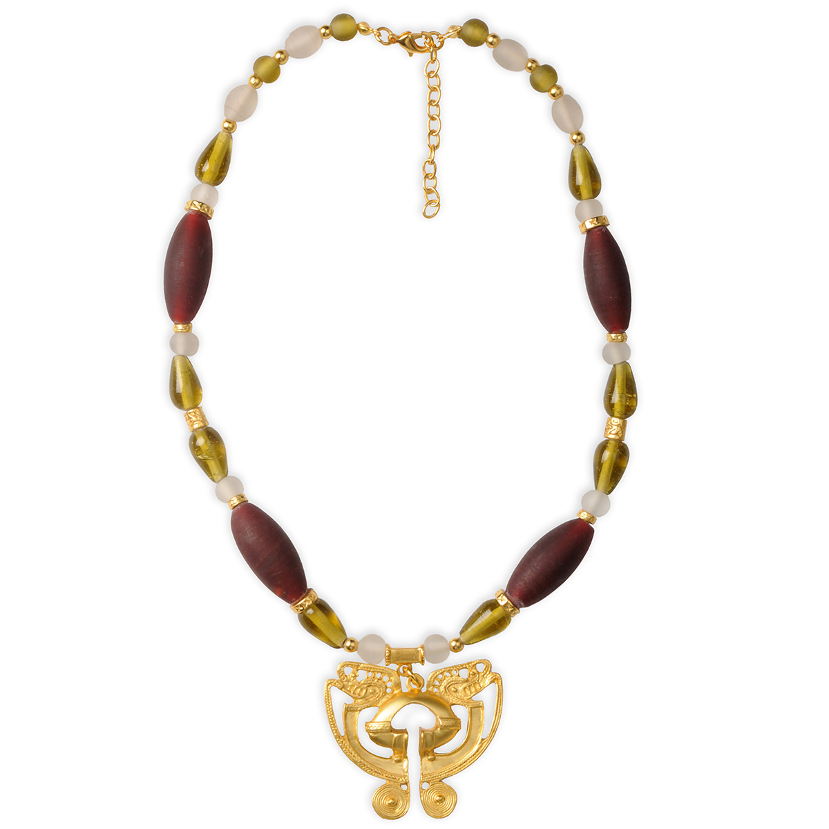 Colier cu cristale, separatoare si pandantiv fluture cu 2 capete de sarpe, cultura Tairona – Bijuterie exotica, traditional sud-americana, cu stil unic si simbolistica deosebita. Colier cu cristale fabricate in Cehia, de inalta calitate. Aliaj de argint cu staniu placat cu aur de 24k. Nu contine nichel. Aceste bijuterii cu aspect vintage sunt fabricate de artizani columbieni care, de-a lungul generatiilor, au pastrat traditia artei precolumbiene.