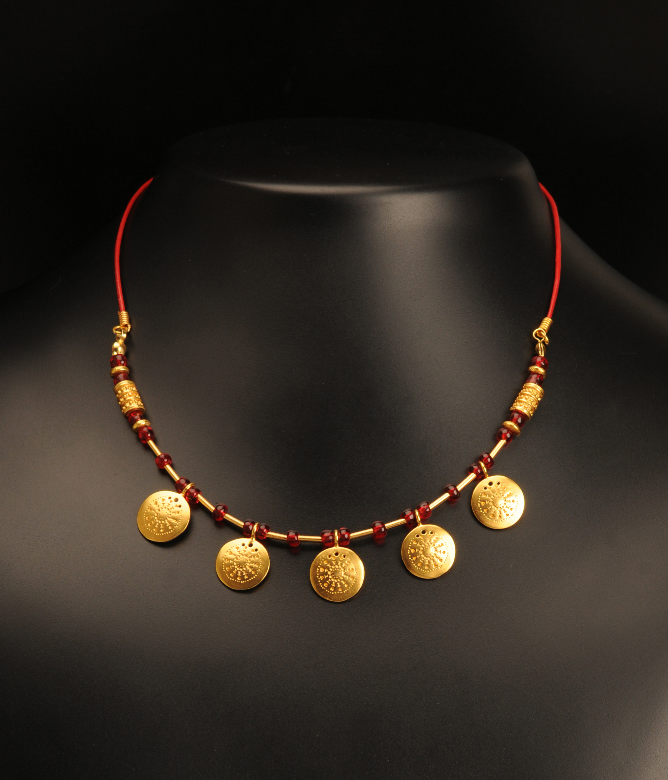 Colierul cu piele, margele si 5 pandantive calendarul astrologic, cultura Muisca, este o bijuterie exotica, traditional sud-americana, cu stil unic si simbolistica deosebita. Aliaj de argint cu staniu placat cu aur de 24k sau argint pur. Nu contine nichel. Aceste bijuterii cu aspect vintage sunt fabricate de artizani columbieni care, de-a lungul generatiilor, au pastrat traditia artei precolumbiene.