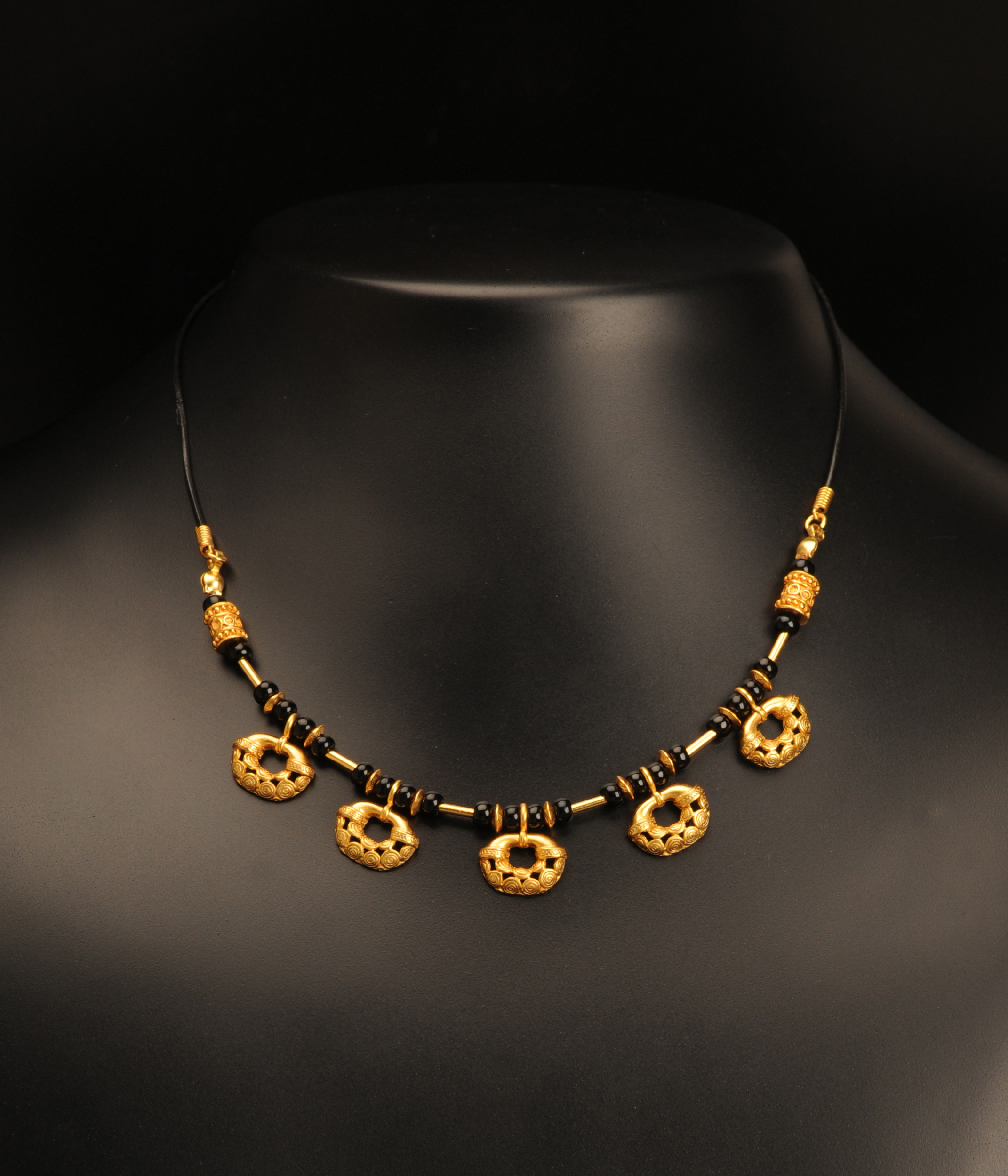 Colierul cu piele si margele si cu 5 pandantive semiluna cu spirala vietii si cele 3 principii, cultura Calima, este o bijuterie exotica, traditional sud-americana, cu stil unic si simbolistica deosebita. Aliaj de argint cu staniu placat cu aur de 24k sau argint pur. Nu contine nichel. Aceste bijuterii cu aspect vintage sunt fabricate de artizani columbieni care, de-a lungul generatiilor, au pastrat traditia artei precolumbiene.
