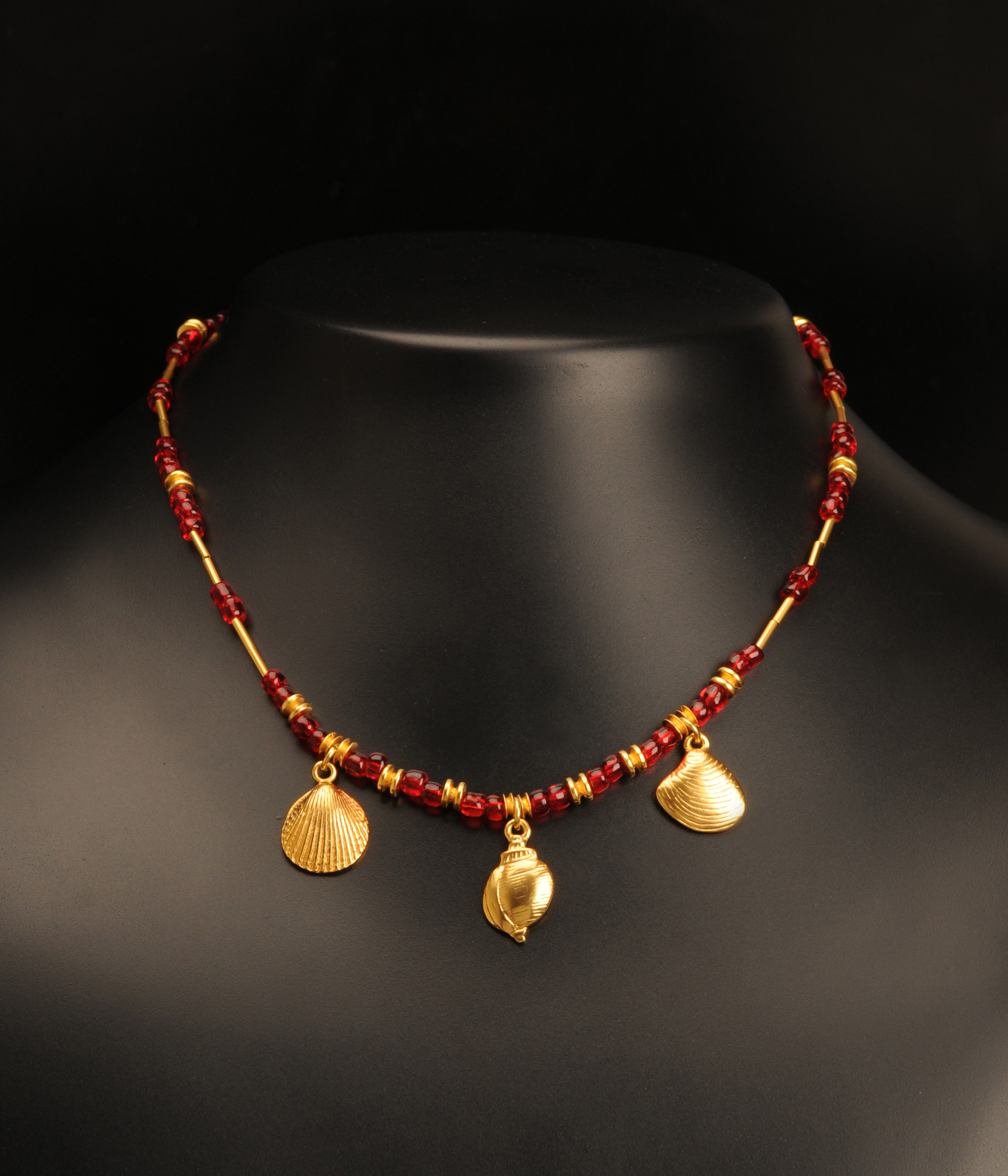Colierul cu margele, separatoare si 3 pandantive scoica este o bijuterie exotica, traditional sud-americana, cu stil unic si simbolistica deosebita. Margelele sunt fabricate in Cehia, de inalta calitate. Aliaj de argint cu staniu placat cu aur de 24k. Nu contine nichel. Aceste bijuterii cu aspect vintage sunt fabricate de artizani columbieni care, de-a lungul generatiilor, au pastrat traditia artei precolumbiene.