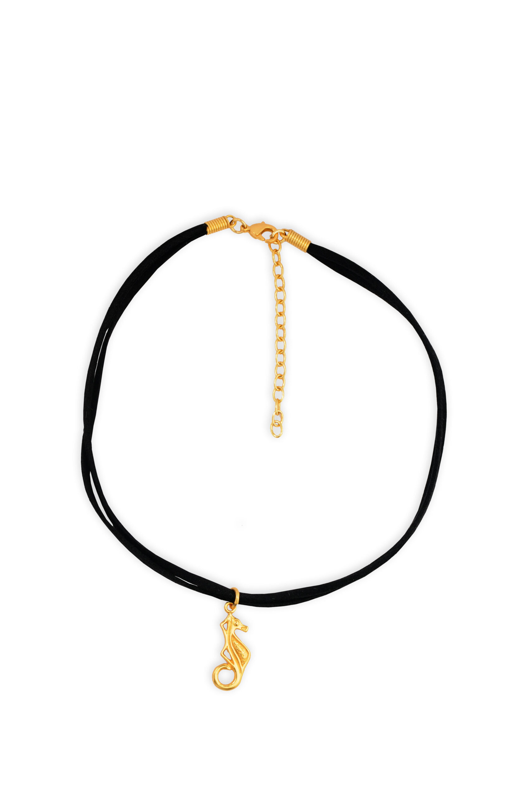 Colierul tip choker din doua randuri de piele intoarsa cu pandantiv calut de mare este o bijuterie exotica, traditional sud-americana, cu stil unic si simbolistica deosebita. Aliaj de argint cu staniu placat cu aur de 24k sau argint pur. Nu contine nichel. Aceste bijuterii cu aspect vintage sunt fabricate de artizani columbieni care, de-a lungul generatiilor, au pastrat traditia artei precolumbiene.