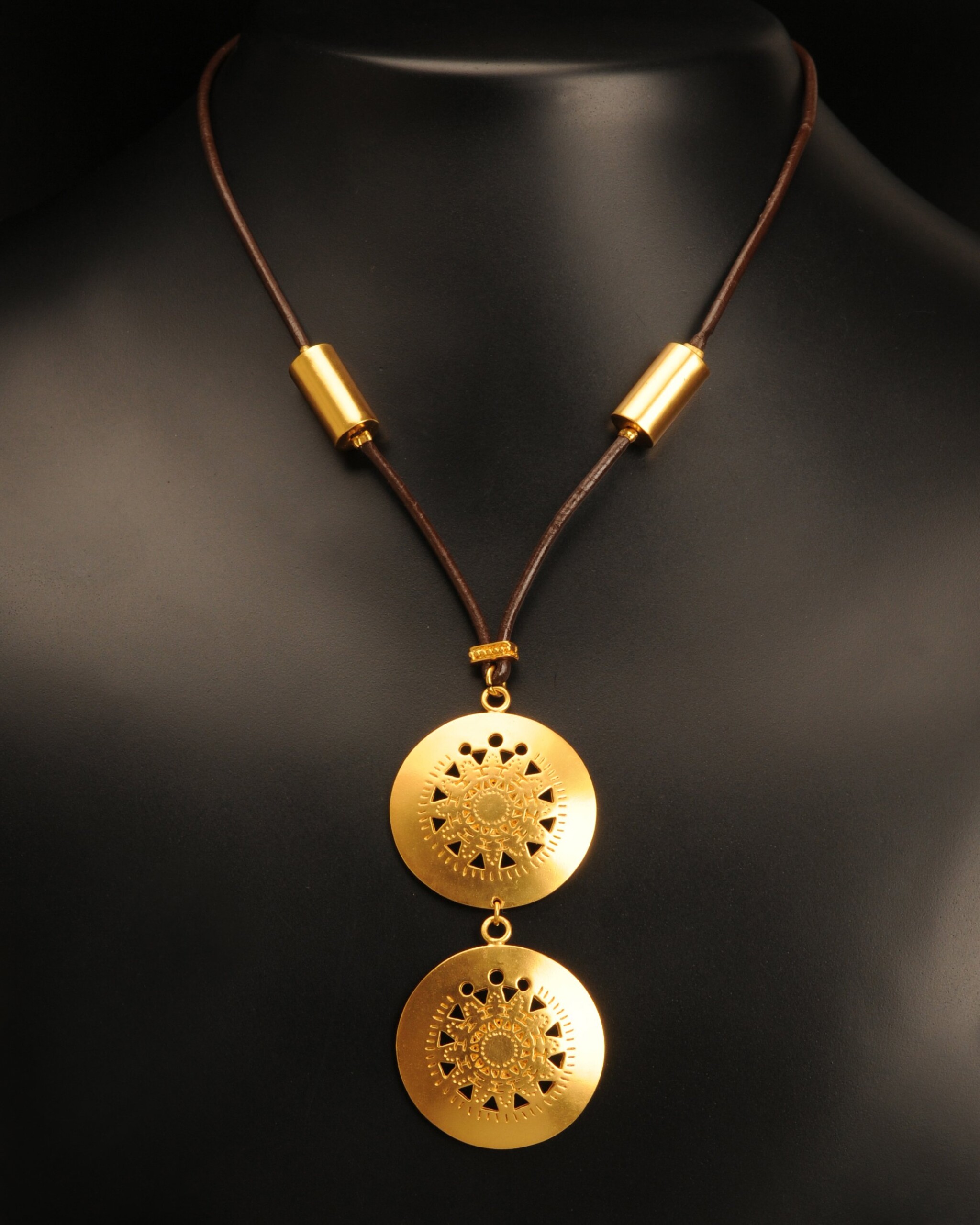 HomeColiereColiere pieleColier piele maro cu 2 pandantive calendarul astrologic, cultura Muisca