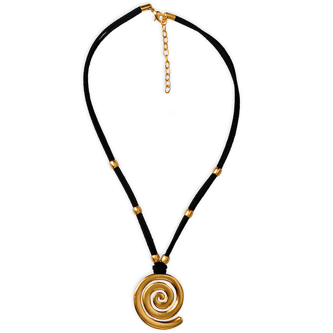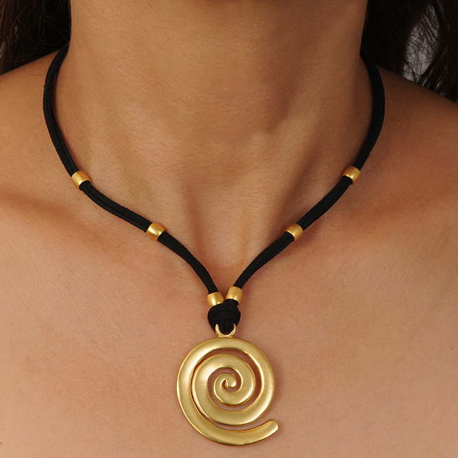 Colierul din piele intoarsa plana, neagra, dubla cu pandantiv mare spirala vietii, cultura Quimbaya este o bijuterie exotica, traditional sud-americana, cu stil unic si simbolistica deosebita. Aliaj de argint cu staniu placat cu aur de 24k. Nu contine nichel. Aceste bijuterii cu aspect vintage sunt fabricate de artizani columbieni care, de-a lungul generatiilor, au pastrat traditia artei precolumbiene.