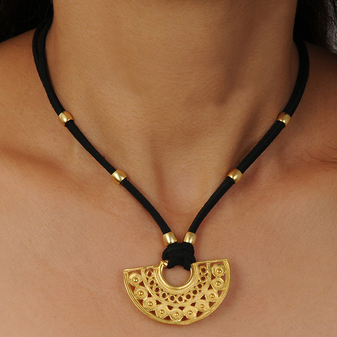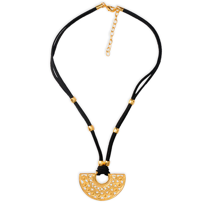 Colierul din piele intoarsa plana, neagra, dubla cu pandantiv semiluna cu cercuri si spirala vietii, cultura Sinú, este o bijuterie exotica, traditional sud-americana, cu stil unic si simbolistica deosebita. Aliaj de argint cu staniu placat cu aur de 24k. Nu contine nichel. Aceste bijuterii cu aspect vintage sunt fabricate de artizani columbieni care, de-a lungul generatiilor, au pastrat traditia artei precolumbiene.