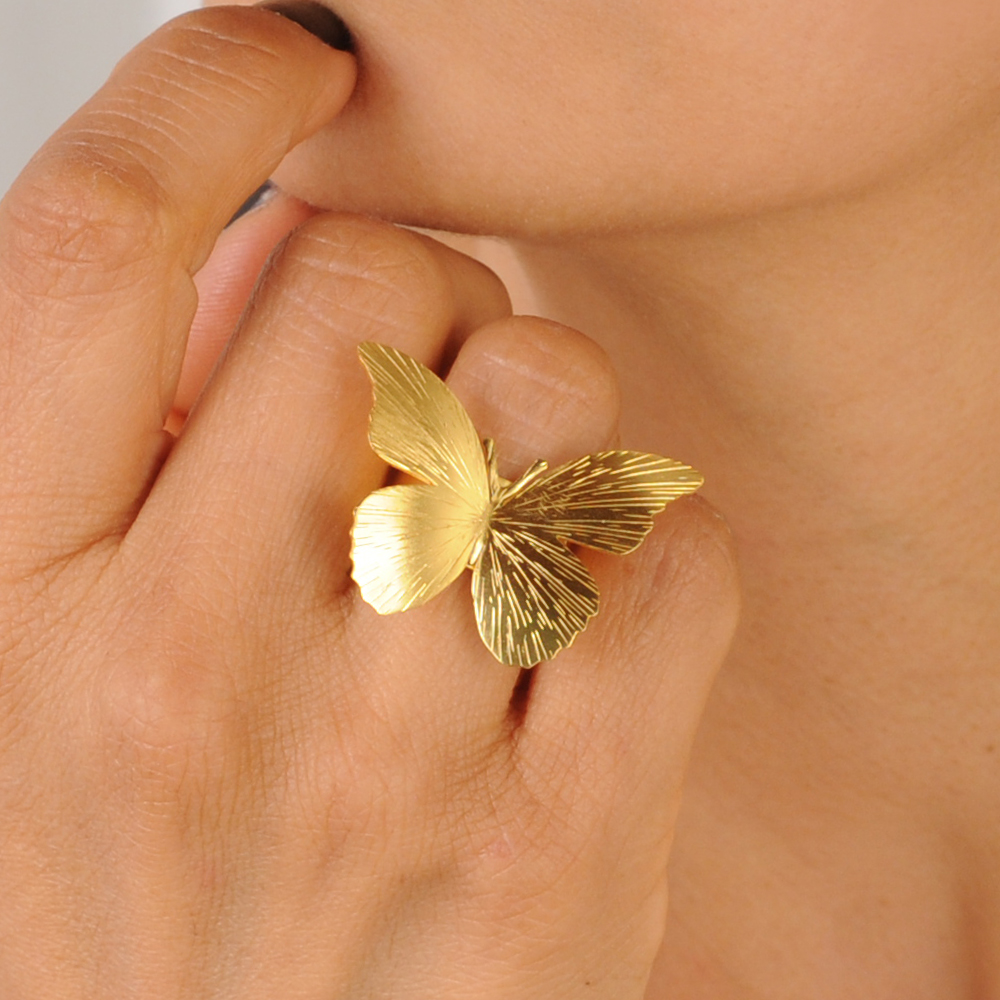 Inelul Renacer fluture mare este lucrat dintr-un aliaj de cupru si zinc, placat cu aur de 24k sau argint pur, si nu contine nichel sau plumb. Este acoperit cu un lac cataforetic pentru a proteja aurul sau argintul si pentru a oferi piesei mai multa durabilitate.