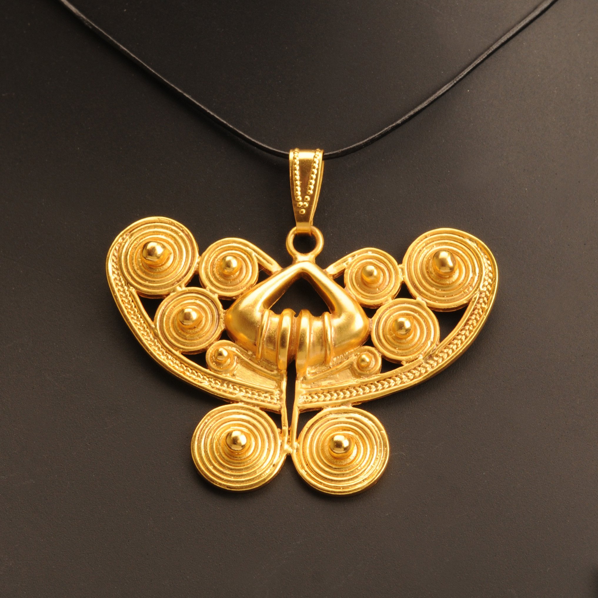Bijuterie exotica, traditional sud-americana, cu stil unic si simbolistica deosebita. Se poate combina cu snur de piele, lant sau anou la baza gatului, devenind in acest fel un colier statement. Aliaj de argint cu staniu placat cu aur de 24k sau argint pur. Nu contine nichel. Aceste bijuterii cu aspect vintage sunt fabricate de artizani columbieni care, de-a lungul generatiilor, au pastrat traditia artei precolumbiene.