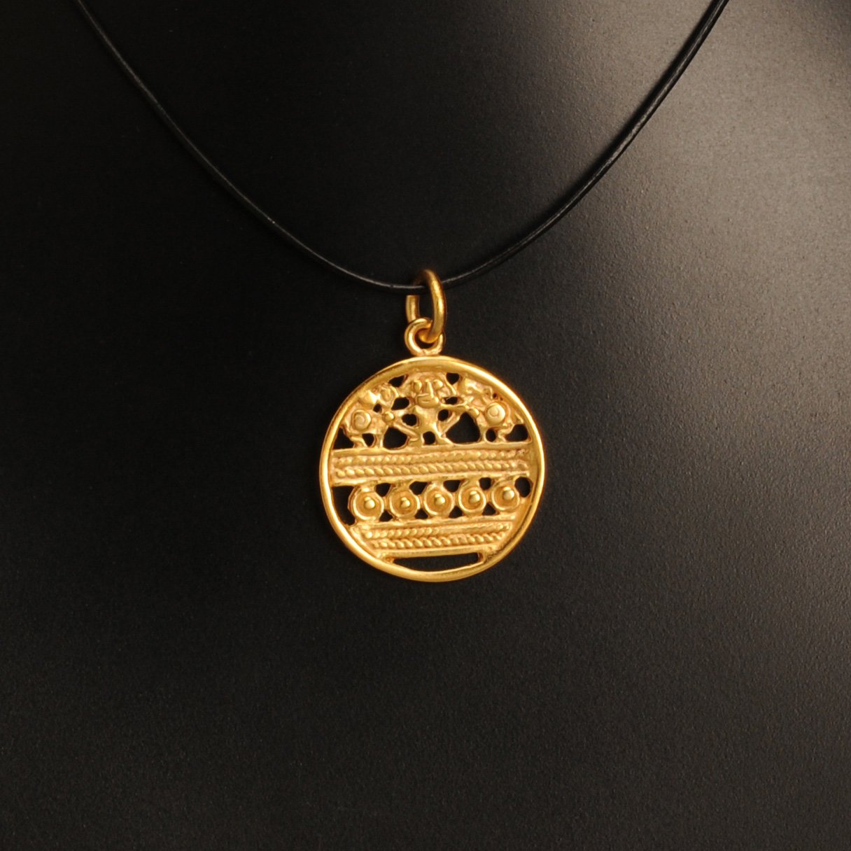 Bijuterie exotica, traditional sud-americana, cu stil unic si simbolistica deosebita. Se poate combina cu snur de piele, lant sau anou la baza gatului, devenind in acest fel un colier statement. Aliaj de argint cu staniu placat cu aur de 24k. Nu contine nichel. Aceste bijuterii cu aspect vintage sunt fabricate de artizani columbieni care, de-a lungul generatiilor, au pastrat traditia artei precolumbiene.