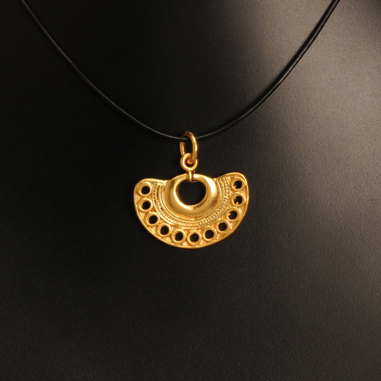Pandantiv semiluna cercuri – Bijuterie exotica, traditional sud-americana, cu stil unic si simbolistica deosebita. Se poate combina cu snur de piele, lant sau anou la baza gatului, devenind in acest fel un colier statement. Aliaj de argint cu staniu placat cu aur de 24k. Nu contine nichel. Aceste bijuterii cu aspect vintage sunt fabricate de artizani columbieni care, de-a lungul generatiilor, au pastrat traditia artei precolumbiene.