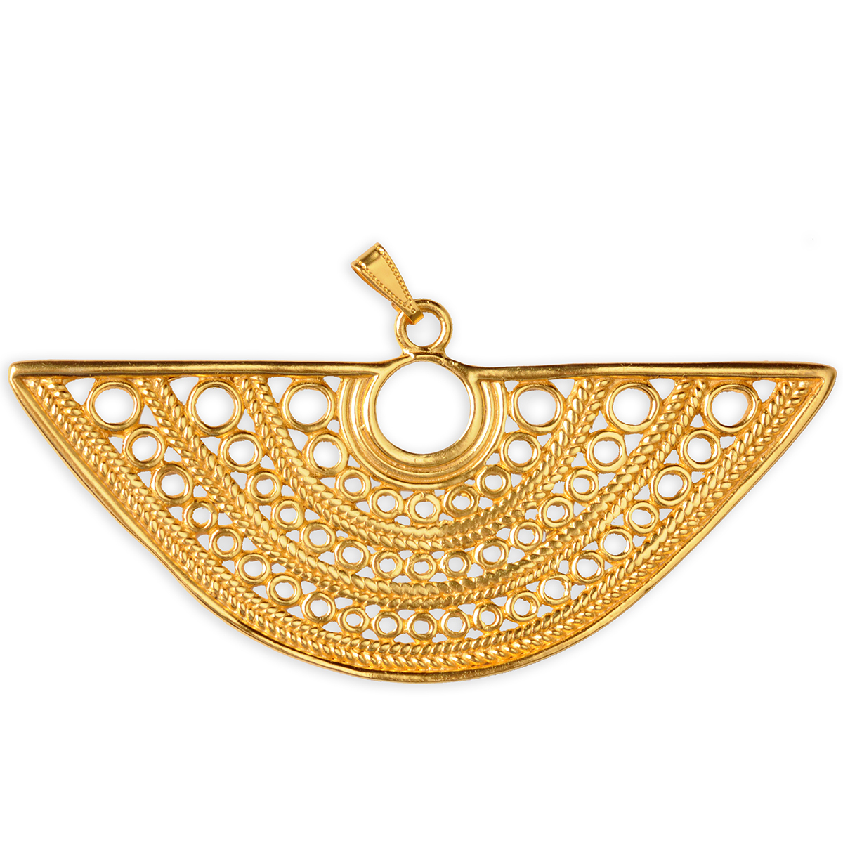 Pandantiv semiluna cu cercuri, cultura Sinú – Bijuterie exotica, traditional sud-americana, cu stil unic si simbolistica deosebita. Aliaj de argint cu staniu placat cu aur de 24k. Nu contine nichel. Aceste bijuterii cu aspect vintage sunt fabricate de artizani columbieni care, de-a lungul generatiilor, au pastrat traditia artei precolumbiene.