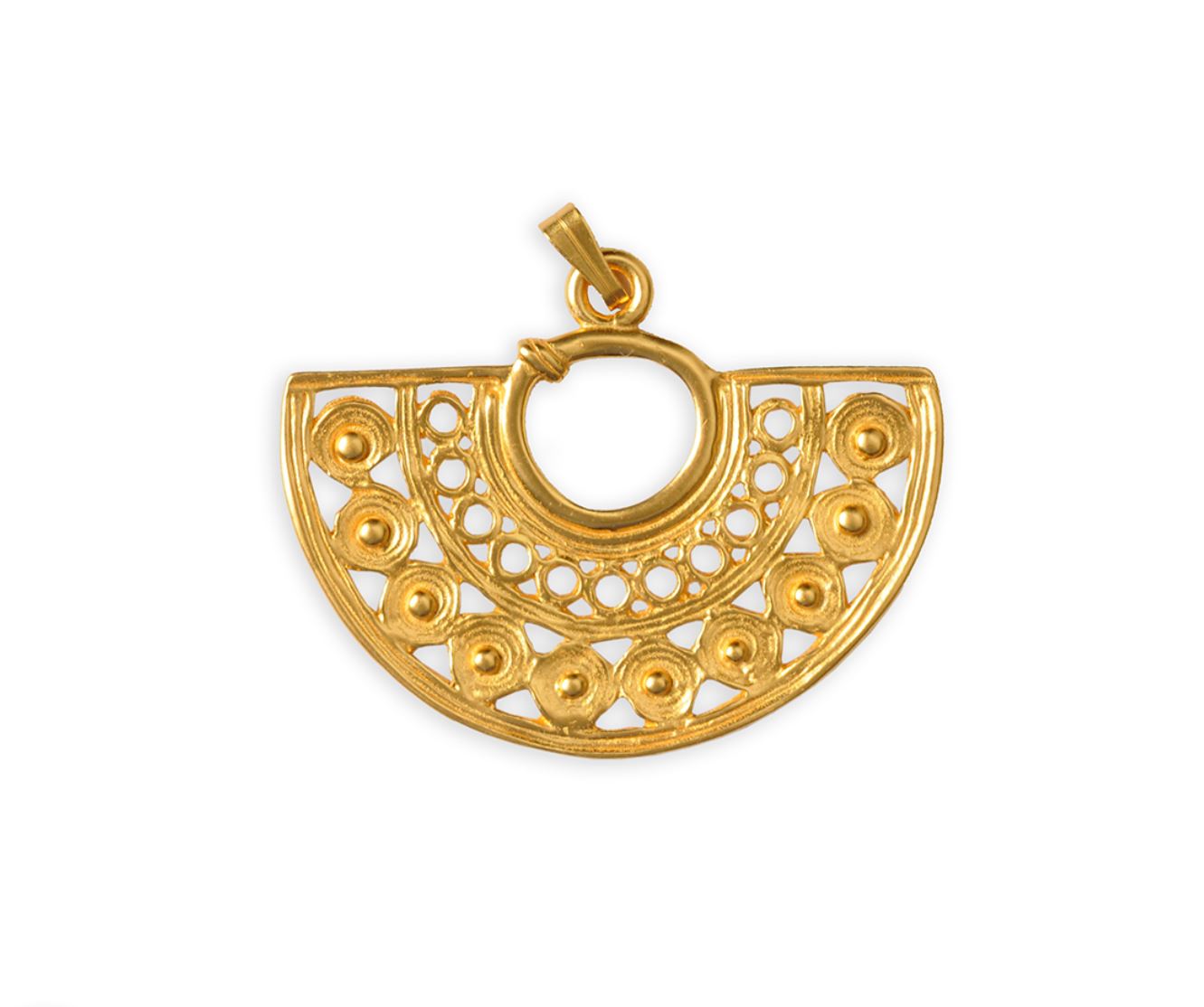 Pandantivul semiluna cu cercuri si spirala vietii, cultura Sinú, este o bijuterie exotica, traditional sud-americana, cu stil unic si simbolistica deosebita. Se poate combina cu snur de piele, lant sau anou la baza gatului, devenind in acest fel un colier statement. Aliaj de argint cu staniu placat cu aur de 24k. Nu contine nichel. Aceste bijuterii cu aspect vintage sunt fabricate de artizani columbieni care, de-a lungul generatiilor, au pastrat traditia artei precolumbiene.