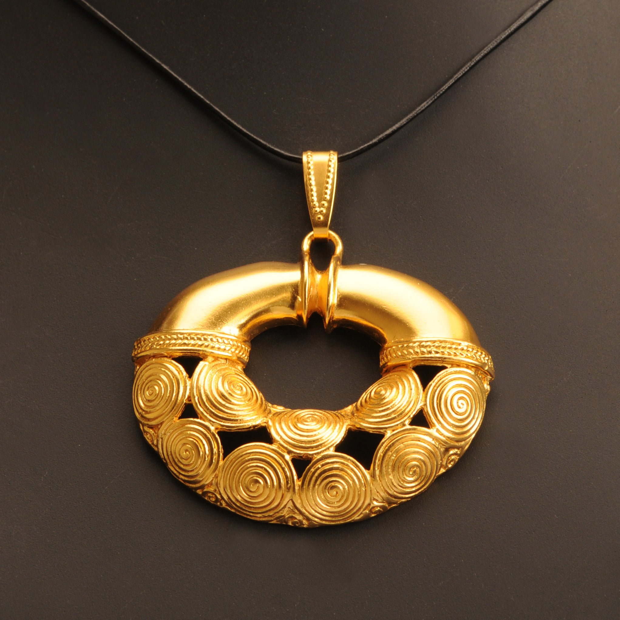Bijuterie exotica, traditional sud-americana, cu stil unic si simbolistica deosebita. Se poate combina cu snur de piele, lant sau anou la baza gatului, devenind in acest fel un colier statement. Aliaj de argint cu staniu placat cu aur de 24k sau argint pur. Nu contine nichel. Aceste bijuterii cu aspect vintage sunt fabricate de artizani columbieni care, de-a lungul generatiilor, au pastrat traditia artei precolumbiene.